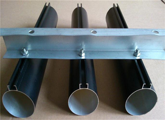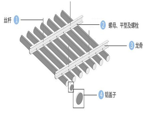 鋁合金鋁圓管天花系統(tǒng)利用上層C槽龍骨,以特別方頭小螺絲和圓管連接,形成一個堅固整體的懸吊裝飾系統(tǒng)。